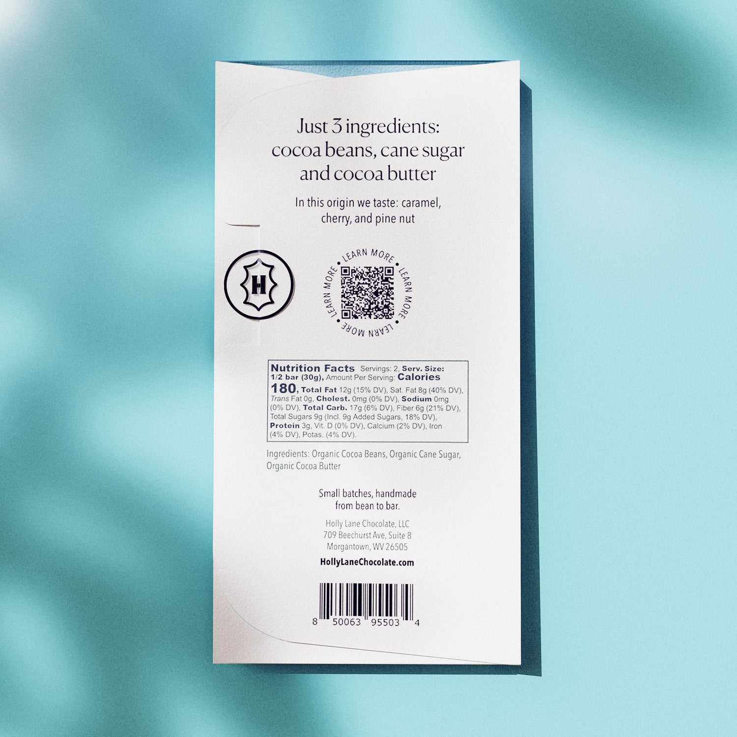 A single-origin, bean-to-bar dark chocolate bar. Made with organic cocoa beans from Zorzal Estate, a private estate and fermentary located in Cibao, Dominican Republic.